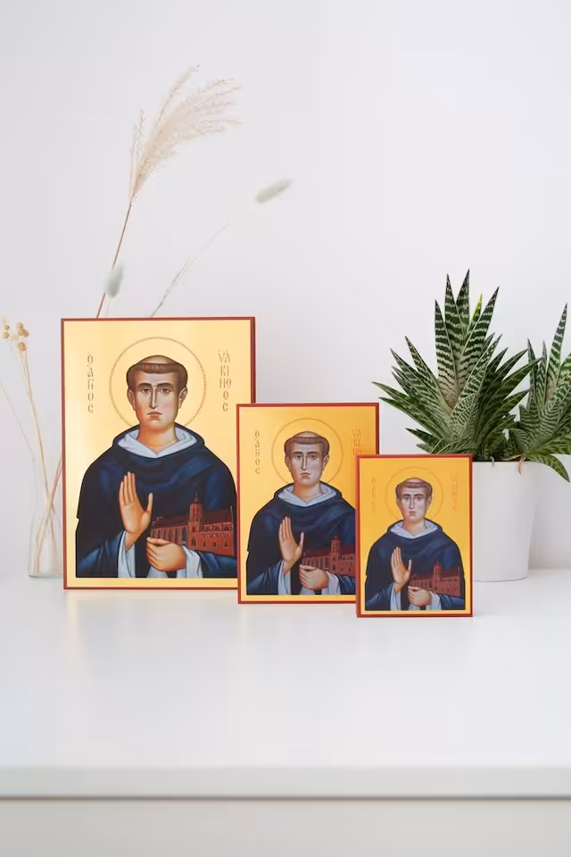 Artprint to druk cyfrowy bezmatrycową aplikacją folii metalizowanej (sleeking), na papierze kreda 350g z folią soft touch. Ikona jest wykonana ręcznie i pomimo troski o każdy szczegół istnieje możliwość przeniesienia maleńkich drobinek złotej folii na wizerunek oraz istnienie drobnych odprysków na pozłoconej części ikony.